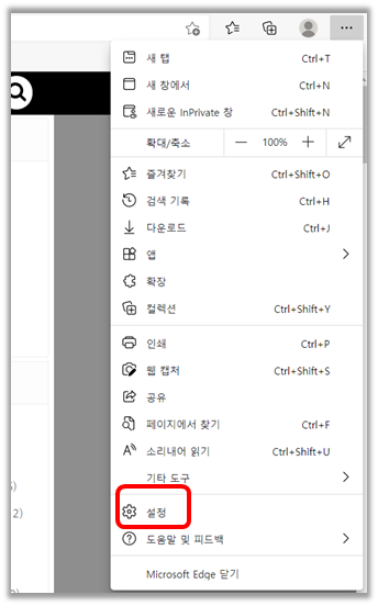 먼저 Edge 상단의 우측에 위치한 ...인 더보기를 누르시고 설정에 들어갑니다.