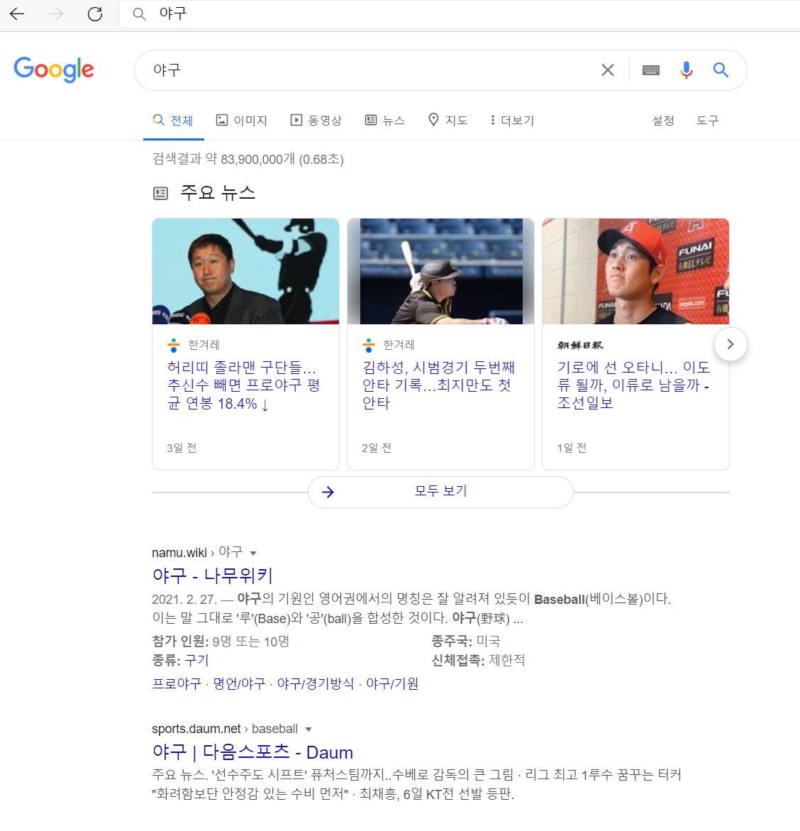 아까 검색 주소창에서 사용된 검색엔진에서 설정된 구글에서 검색이 됨을 확인할 수 있습니다.
