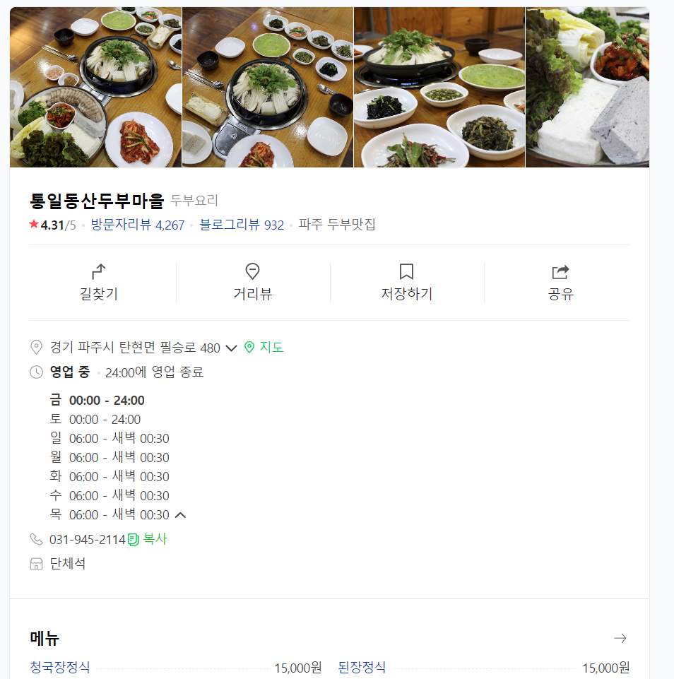 파주의 특산물인 장단콩 맛집인 통일동산두부마을에 다녀왔습니다
