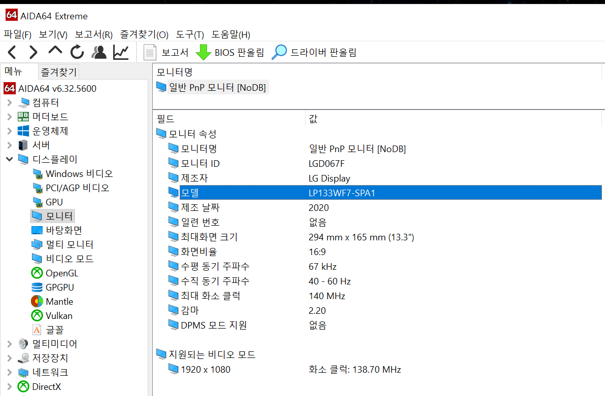 일단 AIDA64를 통해서 확인해 보니 저는 LP133WF7-SPA1이라고 나오네요.