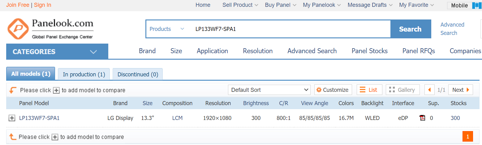 상단의 Products 칸에 아까 확인한 패널 번호인 LP133WF7-SPA1를 넣고 Search를 누릅니다.