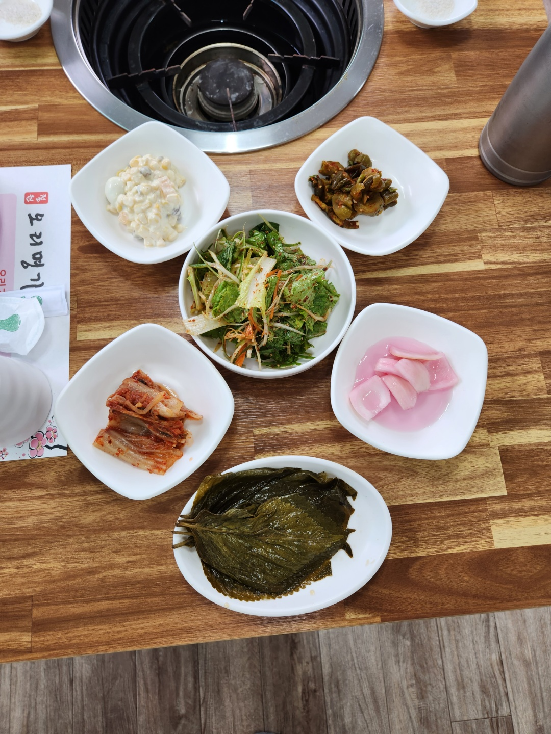주문하면 아래처럼 밑반찬이 나오구요. 밑반찬 중에서 파절임과 콘샐러드가 참 맛있었습니다.