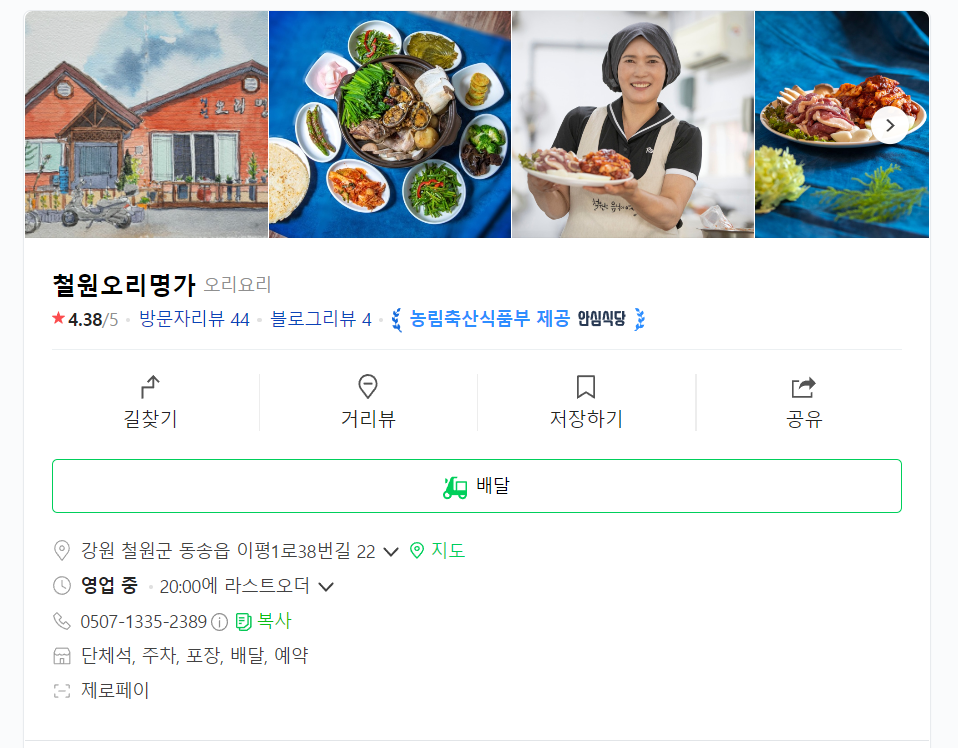 강원 철원군 동송읍 이평1로38번길 22에 위치한 오리고기집입니다.