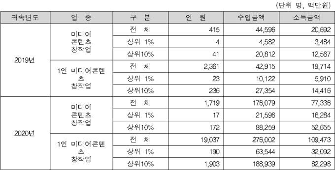 2020년 기준 1인 미디어 콘텐츠 창작업의 인원은 19037명이고, 인당 평균 소득금액은 575만원 수준입니다.