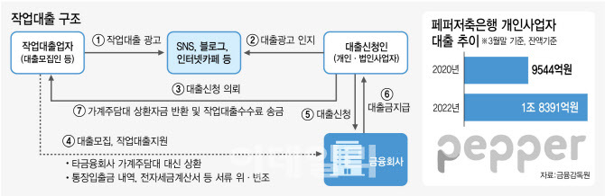 페퍼저축은행은 최근 몇 년간 개인사업자 대출을 크게 늘리며 성장했다. 이 회사 개인사업자 대출 잔액은 2020년 3월 말 9544억원에서 올해 3월 말 1조8391억원으로 93%(8847억원) 늘었다. 같은 기간 가계대출 증가율(55%)의 2배 가까운 속도다. 개인사업자 대출 증가액(8847억원) 가운데 불법 작업대출이 약 13%에 달한다. |