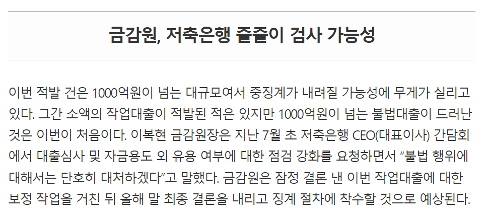 이뿐만 아니라 건전성 확보를 위해 다른 저축은행 역시 줄줄이 검사할 것이라고 밝혔습니다