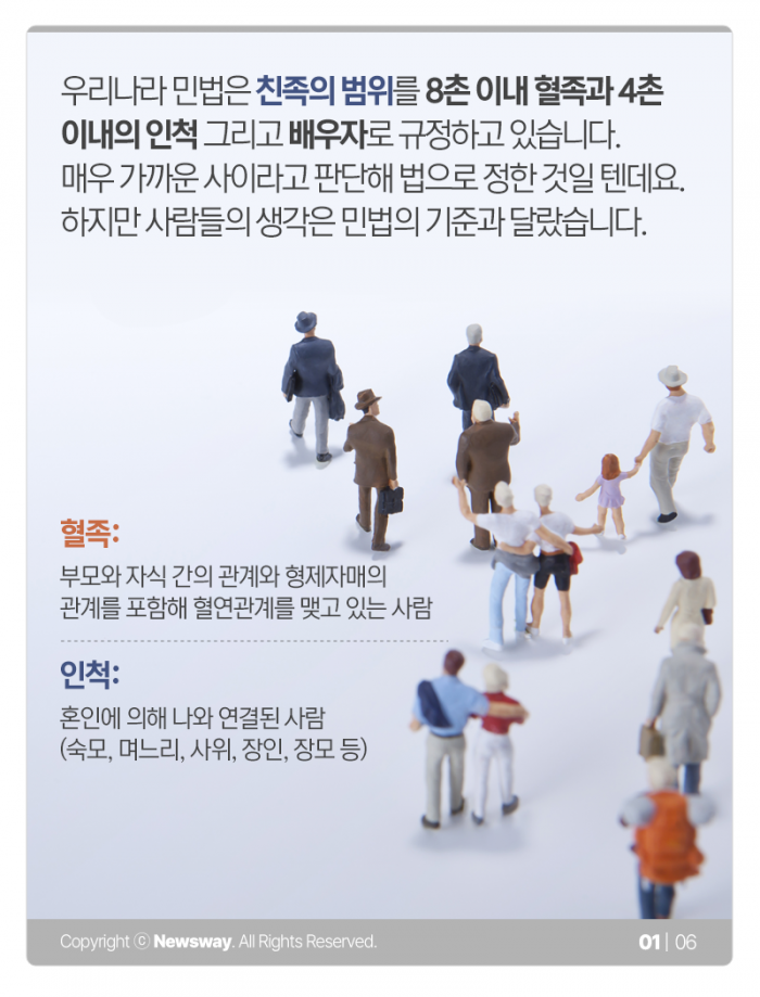우리나라의 민법은 친족의 범위를 8촌이내 혈족과 4촌이내의 인척 그리고 배우자로 규정하고 있습니다.