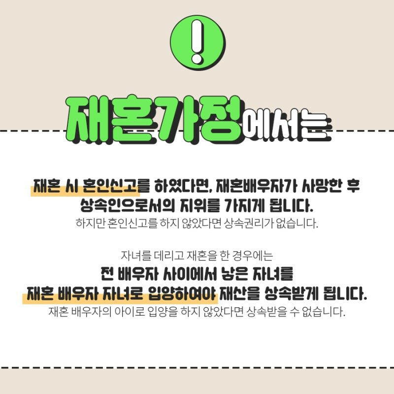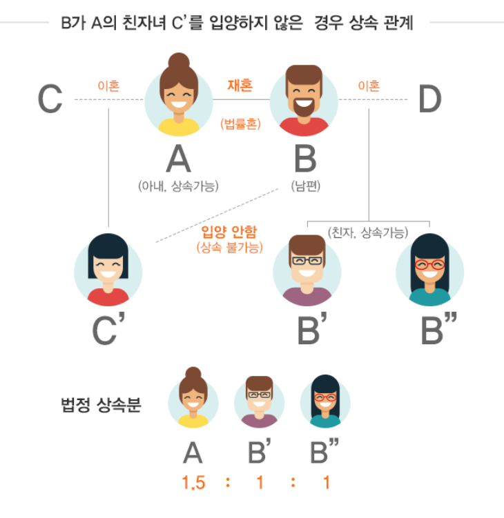 다만 재혼 배우자가 생전에 입양을 한 경우 법률상 친자관계가 성립하며, 상속권도 갖게 됩니다.