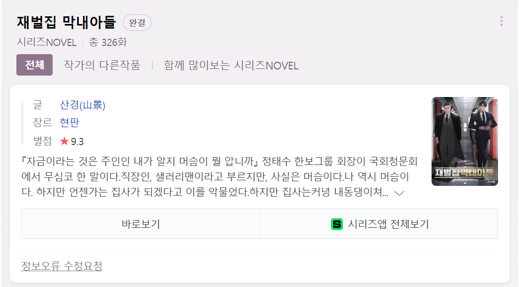 산경 작가가 썼으며, 소설도 평점이 9.3점이나 될정도로 높은 인기를 끌었습니다.