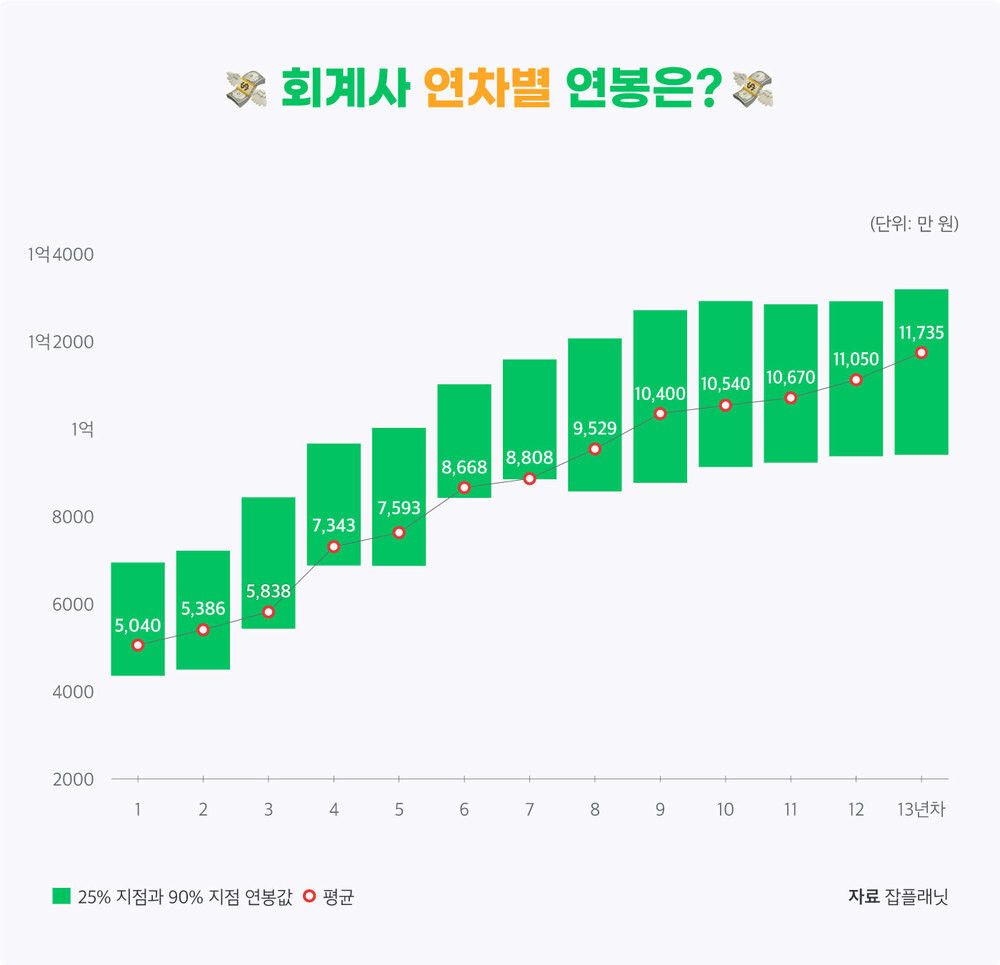 회계사는 저연차가 많을 하위 25% 평균 연봉이 5528만 원, 상위 10%는 1억 425만 원으로 1억원을 넘겼습니다.