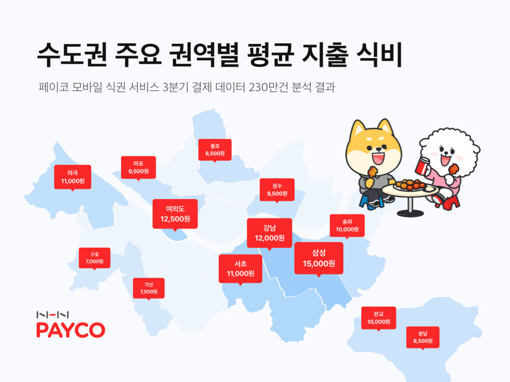 페이코에서 수도권 주요 권역별 평균 지출 식비를 공개하였습니다.