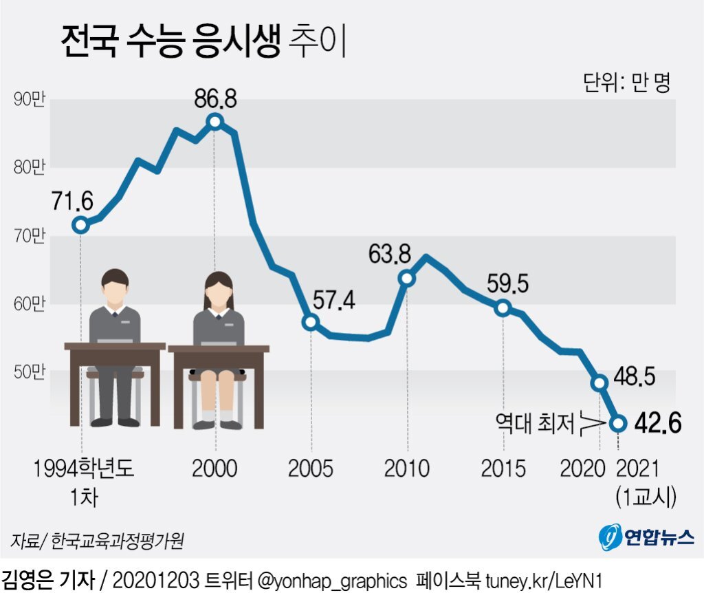 최근 출산률 감소와 연계되어 대학 입학생 역시 엄청나게 줄어들고 있습니다.
