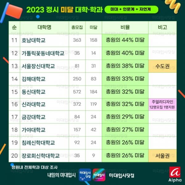 이뿐만 아니라 호남대학교, 카톨릭꽃동네대학교, 서울장신대학교는 무려 수도권이지만 미달되었습니다.