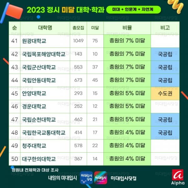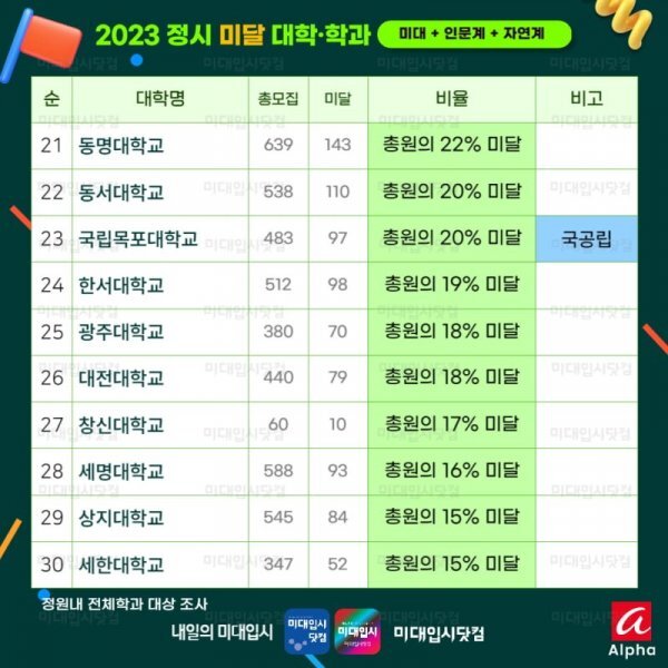 동명대학교, 동서대학교, 국립목포대학교는 국공립학교인데도 미달되었습니다.