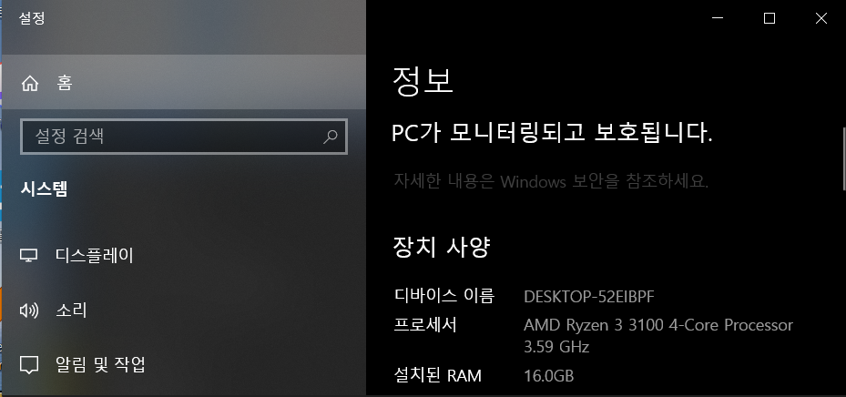 속성 메뉴에 가시면 저의 경우 CPU는 Ryzen 3100/ 메인 메모리는 16G가 설치됨을 알 수 있습니다.