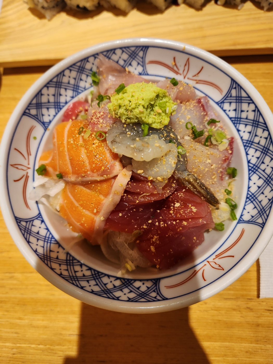 주말이어서 추천이 붙어 있는 지라시덮밥과 연어롤을 시켜보았습니다.