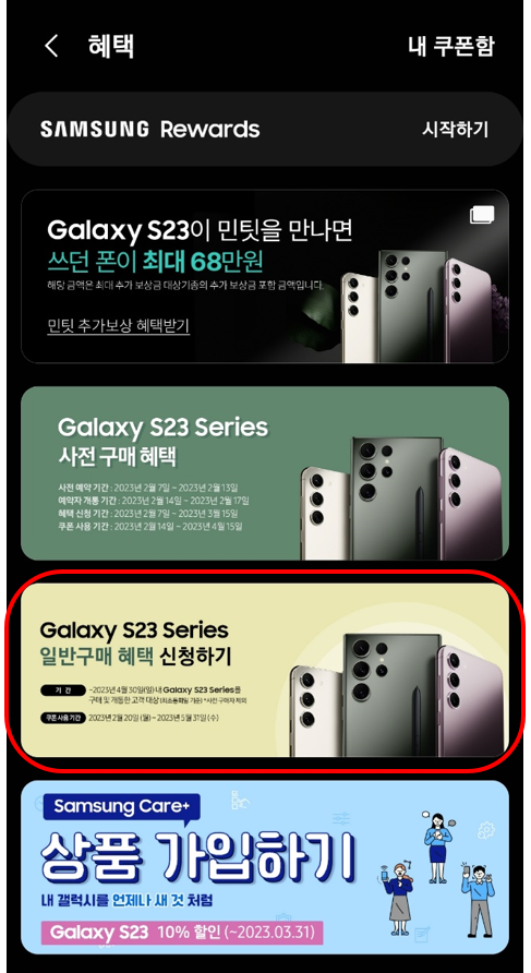 S23 일반 구매 혜택 신청하기를 누르시면 간단하게 신청 가능합니다.