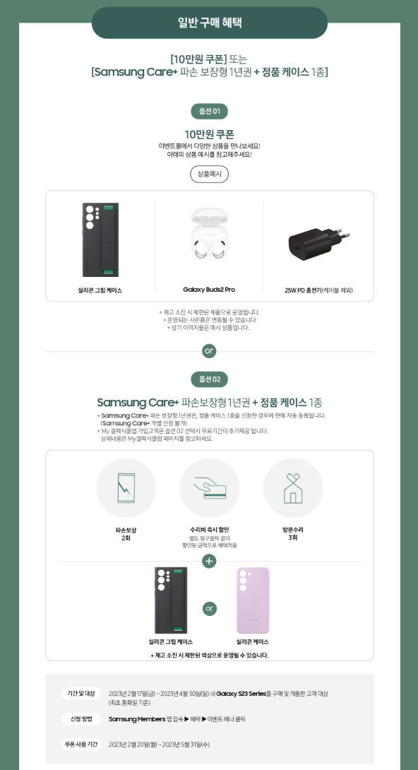 일반 구매의 경우 10만원 쿠폰 및 삼성 케어+ 파손보장형 1년권 + 정품 케이스 중 선택할 수 있는데요.