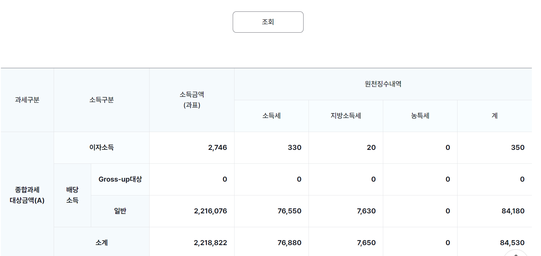 조회를 누르면 2022년 금융소득 종합과세 대상금액을 확인할 수 있습니다.