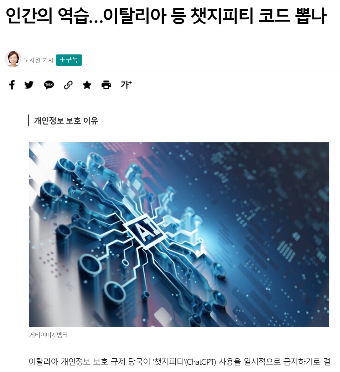 지난달 31일 이탈리아 정보 보호 당국은 챗지피티의 개인정보 수집 상황을 들여다보는 조사를 시작했다면서