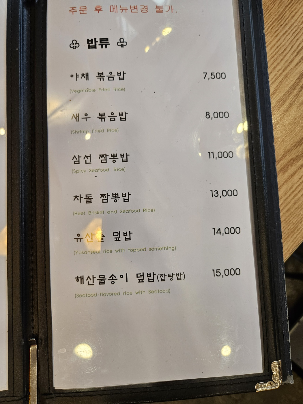 그리고 밥류는 야채볶음밥, 새우 볶음밥, 차돌 짬뽕밥 등이 있습니다.