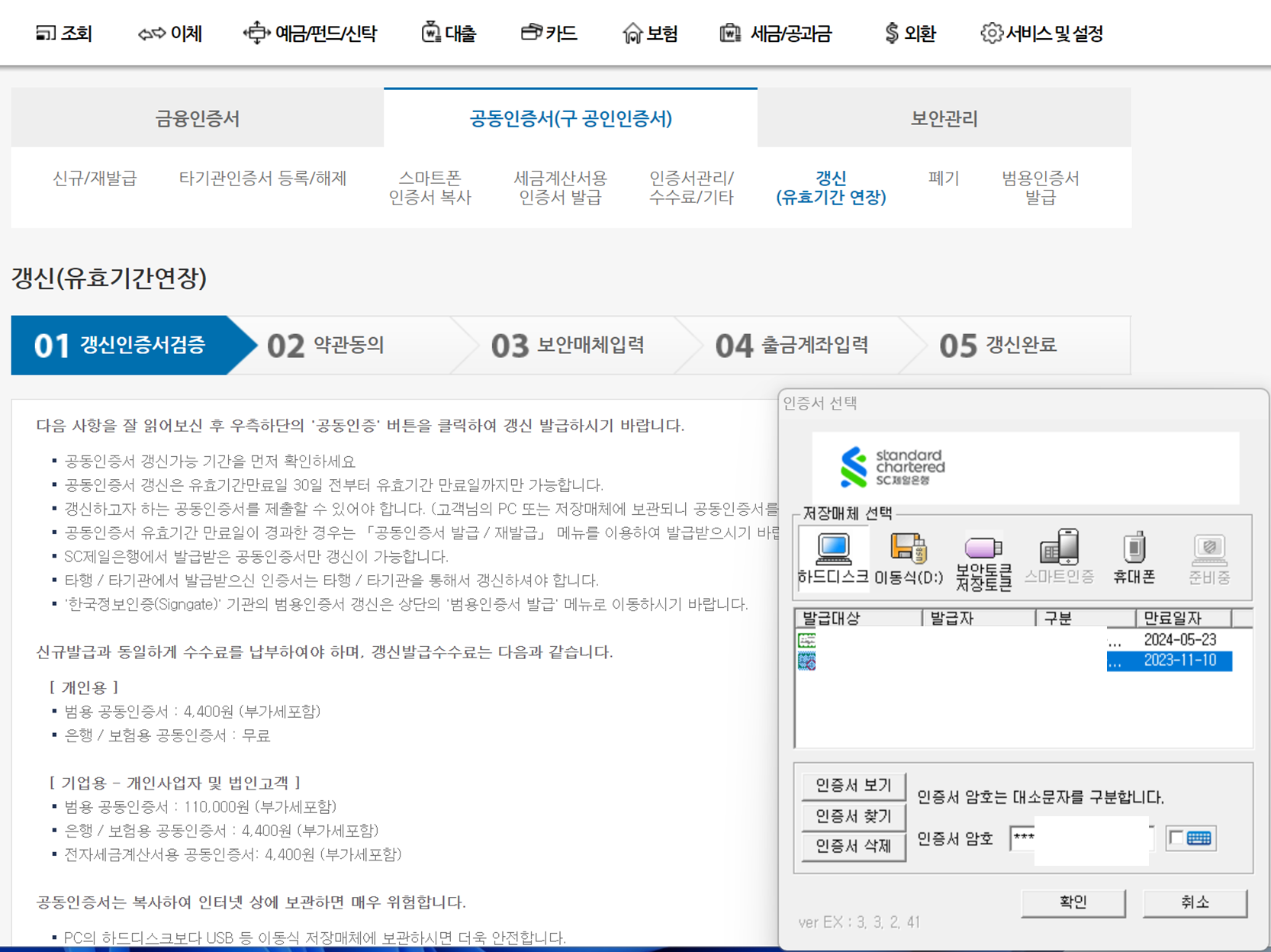 SC제일은행의 경우 메뉴에서 인증센터 - 공동인증서 - 갱신 메뉴에서 갱신이 가능합니다.