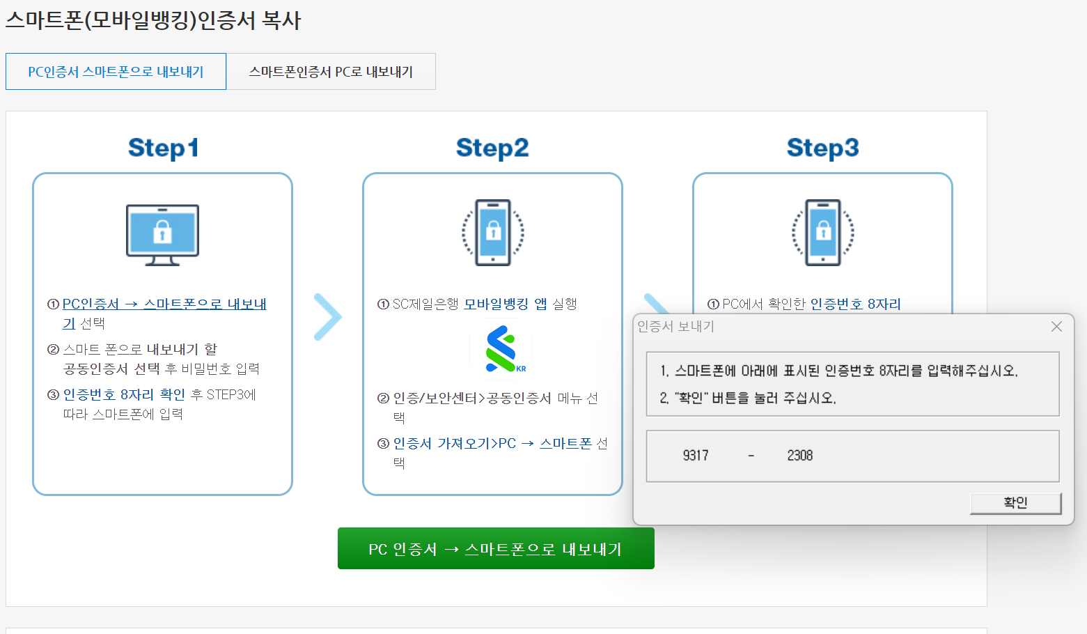 이후 이제 SC제일은행 모바일 앱에서 인증서 가져오기 > PC -> 스마트폰 메뉴에서