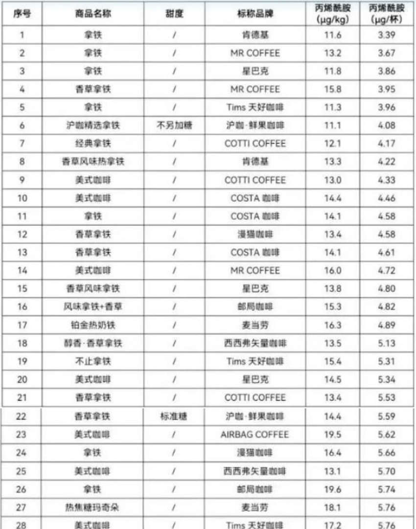 현지 소비자권익보호위원회에 따르면, 이번에 아크릴아마이드가 검출된 커피 브랜드는 루이싱, 모커 등 중국 커피 시장을 주름잡는 토종브랜드뿐만 아니라 스타벅스와 맥도날드, KFC 등 글로벌브랜드도 포함되어 있었다고 합니다.