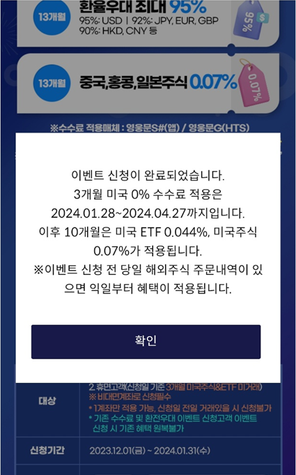 이벤트 신청이 완료되면 미국주식은 매수 0%, ETF는 0.044%입니다.