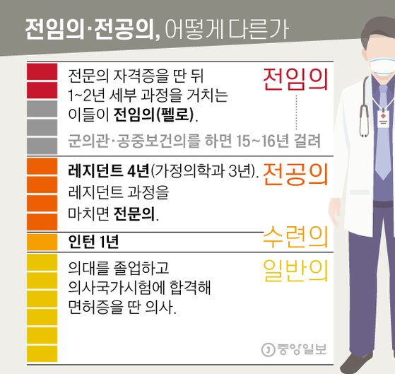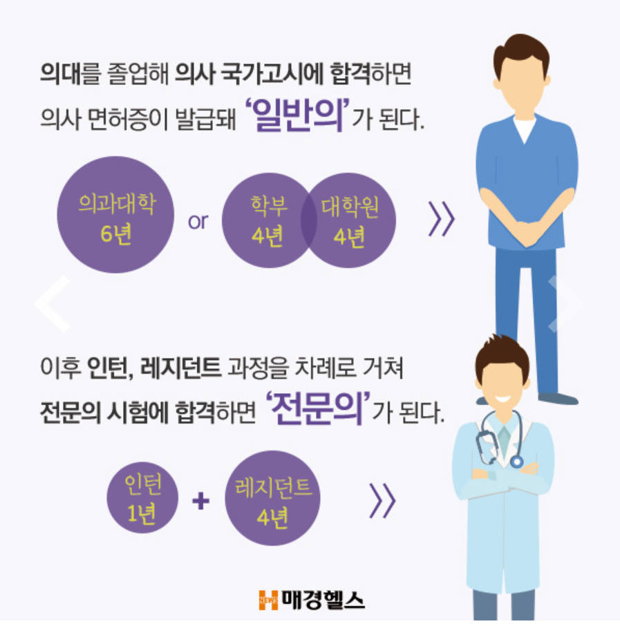 기본적으로 의대를 졸업해 의사 국가고시까지 합격하면 이제부터 의사라고 할 수 있는데요. 의사 국가고시를 합격하면 의사 면허증이 발급돼 '일반의(General Practitioner, GP)'가 됩니다. 일반의가 된 이후 인턴(1년), 레지던트(4년) 과정을 차례로 거쳐 전문의 시험에 합격하면 '전문의'가 되게 됩니다.