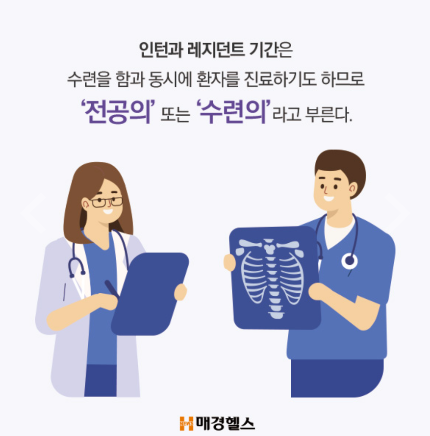 그리고 일반의와 전문의 사이의 인턴과 레지던트 기간은 수련을 함과 동시에 환자를 진료하기도 하므로 '전공의' 또는 '수련의'라고 부릅니다.