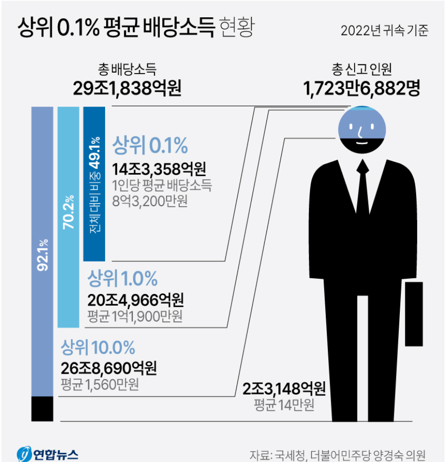 전체 배당소득의 49%를 상위 0.1%가 받은 셈입니다. 이들의 평균 배당소득은 8억 3,200만원이나 된다고 합니다.