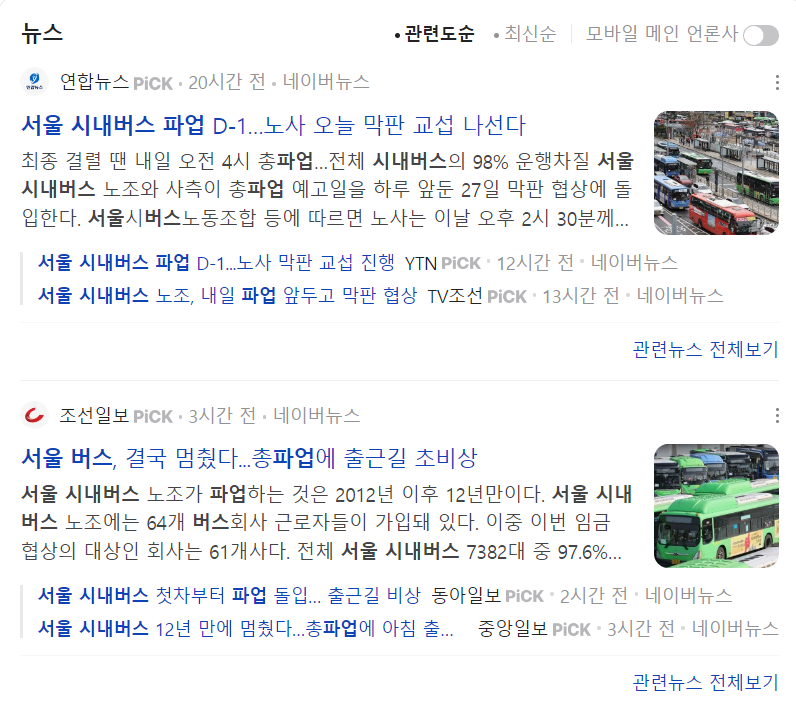 서울 버스노조가 파업을 한건 2012년 20분의 '부분 파업'이 마지막입니다.