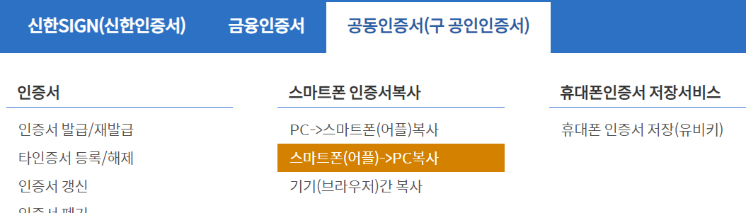신한은행의 경우 신한인증서/금융인증서/공동인증서 3개로 인증이 가능합니다.