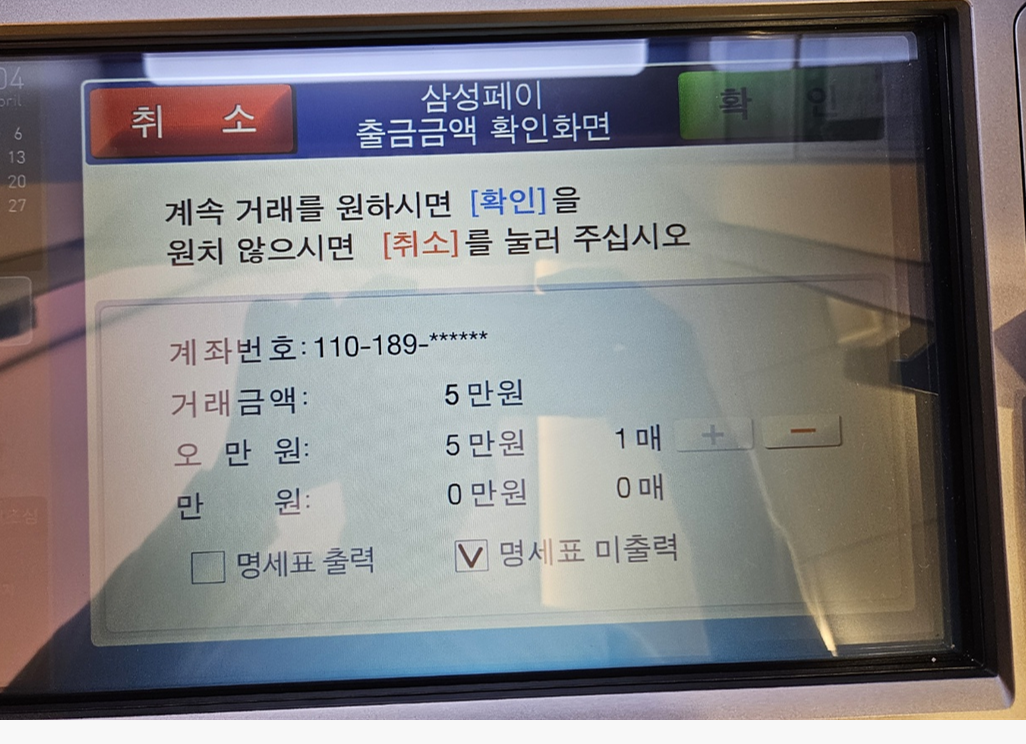 이렇게 삼성페이에 계좌를 등록한 다음 ATM기에서 하단에 있는 삼성페이를 클릭하면 삼성페이로 인출이 가능합니다.