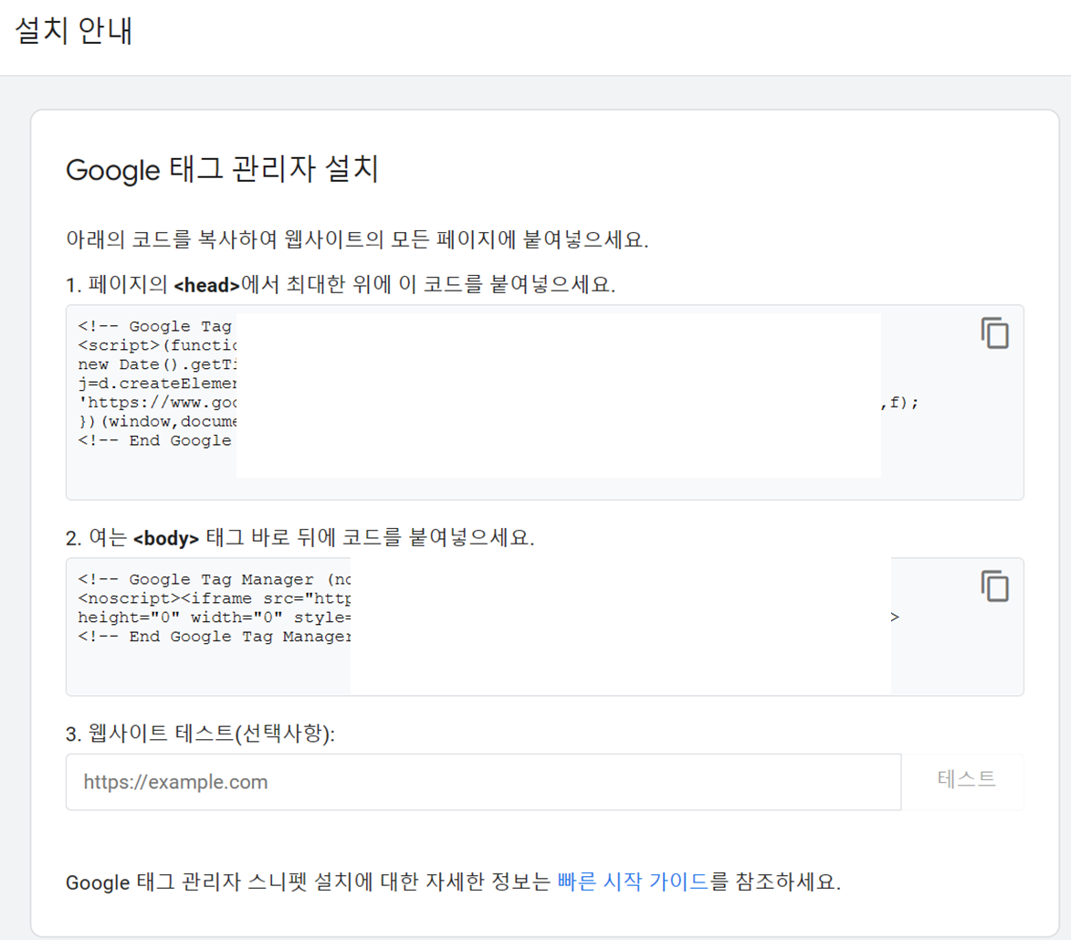 해당 구글 태그 관리자 설치에서 나온 2개를 <head>와 <body>에 복사해주시면 됩니다.