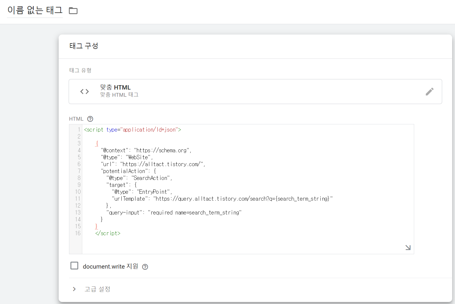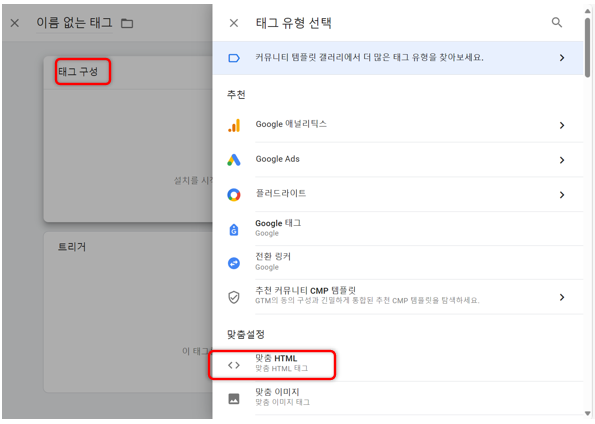 작업공간 - 새 태그 - 태그 구성 - 맞춤 HTML로 들어갑니다.
