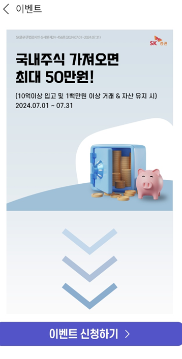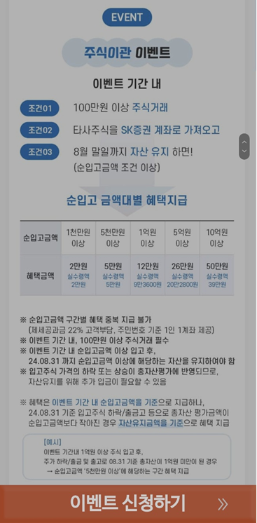 이역시 SK증권의 이벤트 메뉴에서 확인이 가능한데요. 10억이상 입고, 1백만원 이상 거래하면 됩니다.