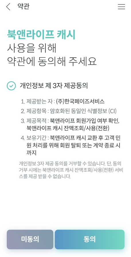이후 북앤라이프 캐시 사용 약관에 동의 누르시구