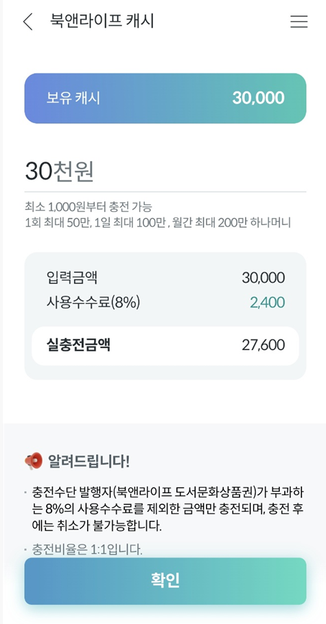 총 3만원의 북앤라이프가 27600원 하나머니로 충전되었습니다.