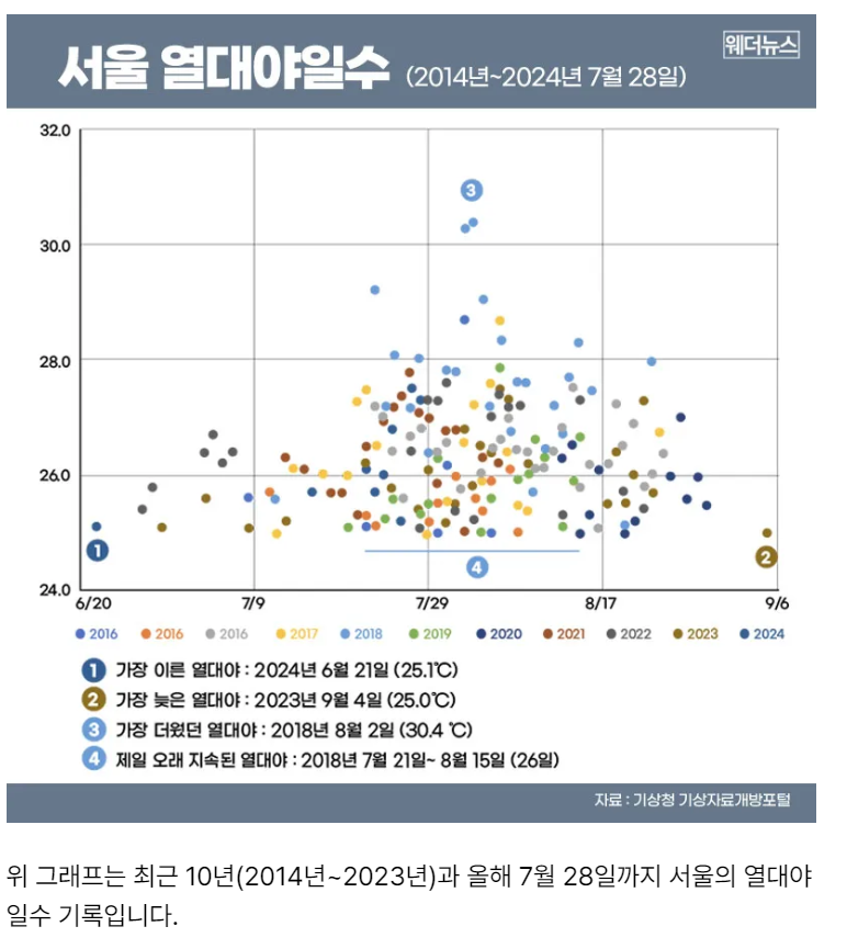 올해(2024년) 여름 서울의 경우 6월 21일에 첫 열대야가 나타나면서, 기상 관측을 시작한 1907년 이래로 가장 이른 열대야로 기록되었습니다. 강릉에서도 6월 11일 올해 첫 열대야가 작년보다 6일 빨리 나타난 데 이어, 밤 최저기온이 30도가 넘는 초열대야도 작년보다 12일 이른 7월 21일에 관측되었습니다.