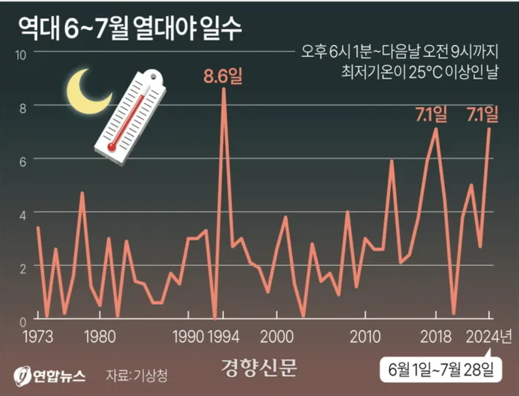 24년에는 7.1일로 역대 2번째로 많은 열대야일수를 보여주고 있습니다.