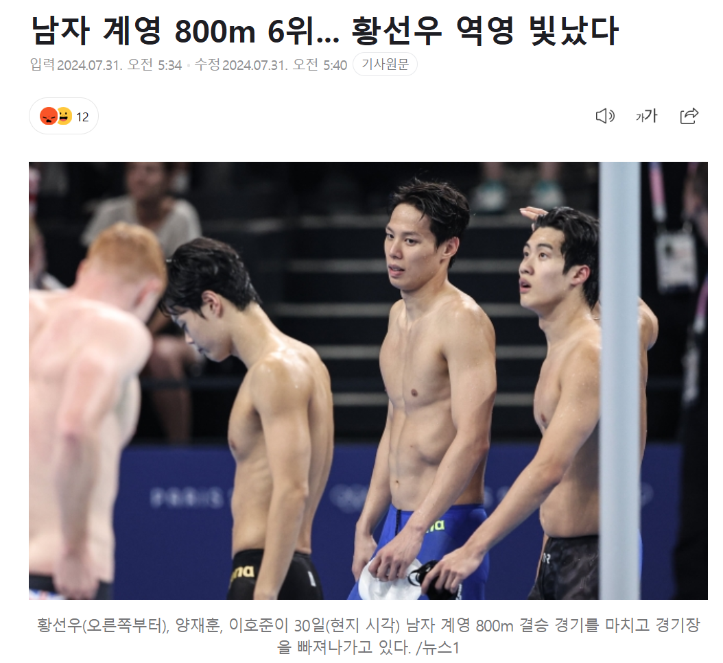 이호준(제주시청), 이유연(고양시청), 김영현(안양시청), 김우민(강원도청)이 7분07초96으로 16개국 중 7위로 사상 첫 결선 진출을 했습니다. 자유형 100m와 같은 날 펼쳐진 예선전에 나서지 않았던 '200m 에이스' 황선우(강원도청)가 고심 끝에 자유형 100m 준결선을 기권, 계영 800m 올인을 선언하기도 했는데요.