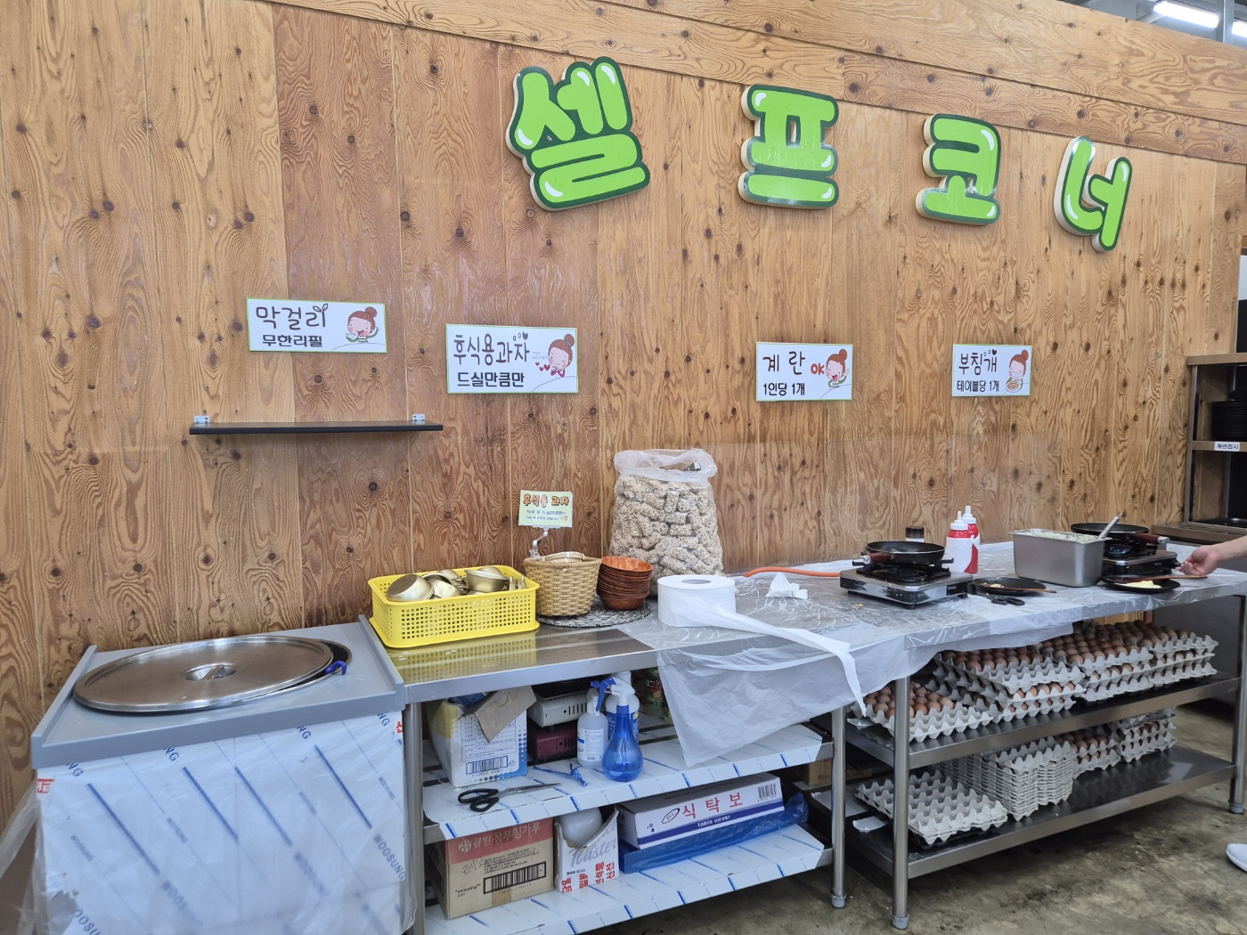 무엇보다 막걸리가 무한리필이 되고, 후식용과자, 계란, 부침개를 셀프로 요리할 수 있습니다.