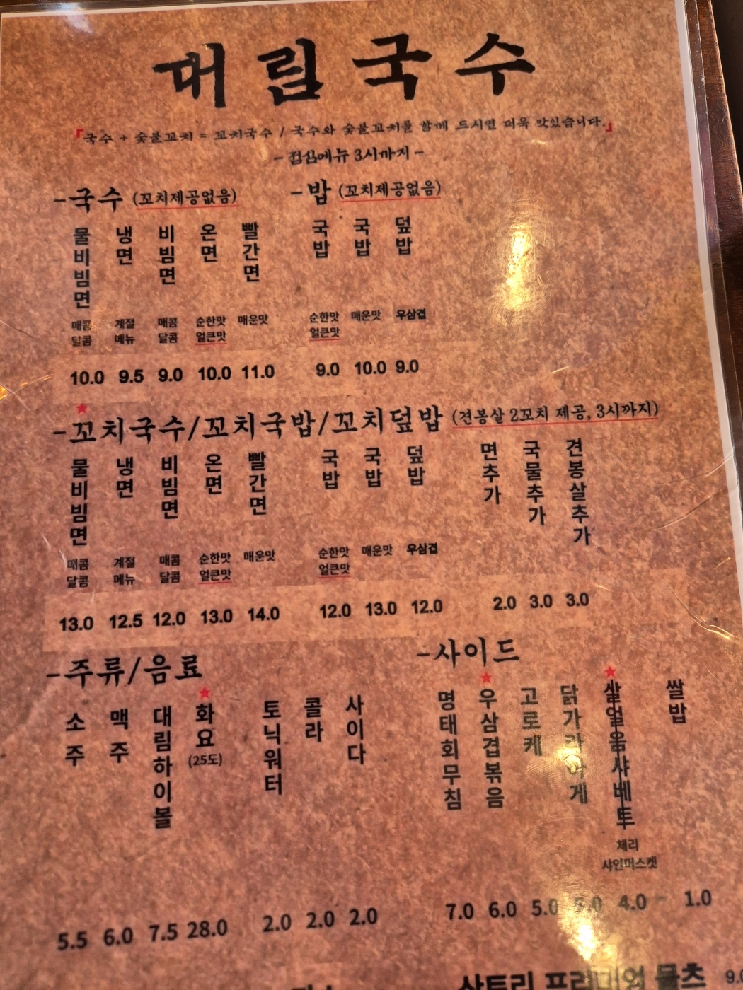일반국수는 1만원대, 꼬치국수는 비빔면은 1.2만원, 온면은 1.3만원입니다.