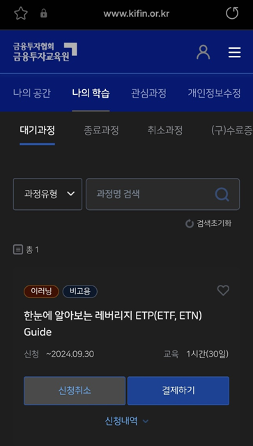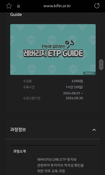 - 금융투자교육원 홈페이지(http://www.kifin.or.kr)에서 '한 눈에 알아보는 레버리지ETP Guide' 과정 신청