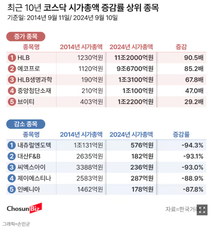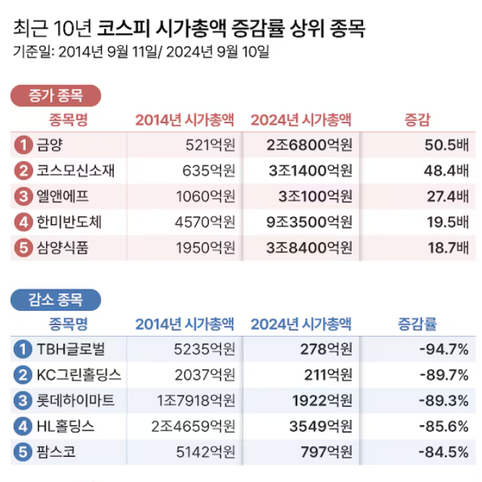 언론에서 코스피·코스닥 상장사 가운데 최근 10년 주가 변동을 살필 수 있는 1648개 종목의 시가총액을 분석한 결과가 놀라웠는데요.
