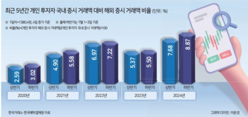 실제로 올해 상반기 국내 개인 투자자의 해외 증시 거래액은 2058억4320만달러(약 284조1459억원)으로 같은 기간 개인 투자자의 국내 증시 거래액 3698조6900억원의 7.68% 수준에 도달한 것으로 나타났습니다. 이는 해외 주식 투자 관련 통계를 작성하기 시작한 2011년 이후 가장 큰 수치라고 할 수 있는데요.