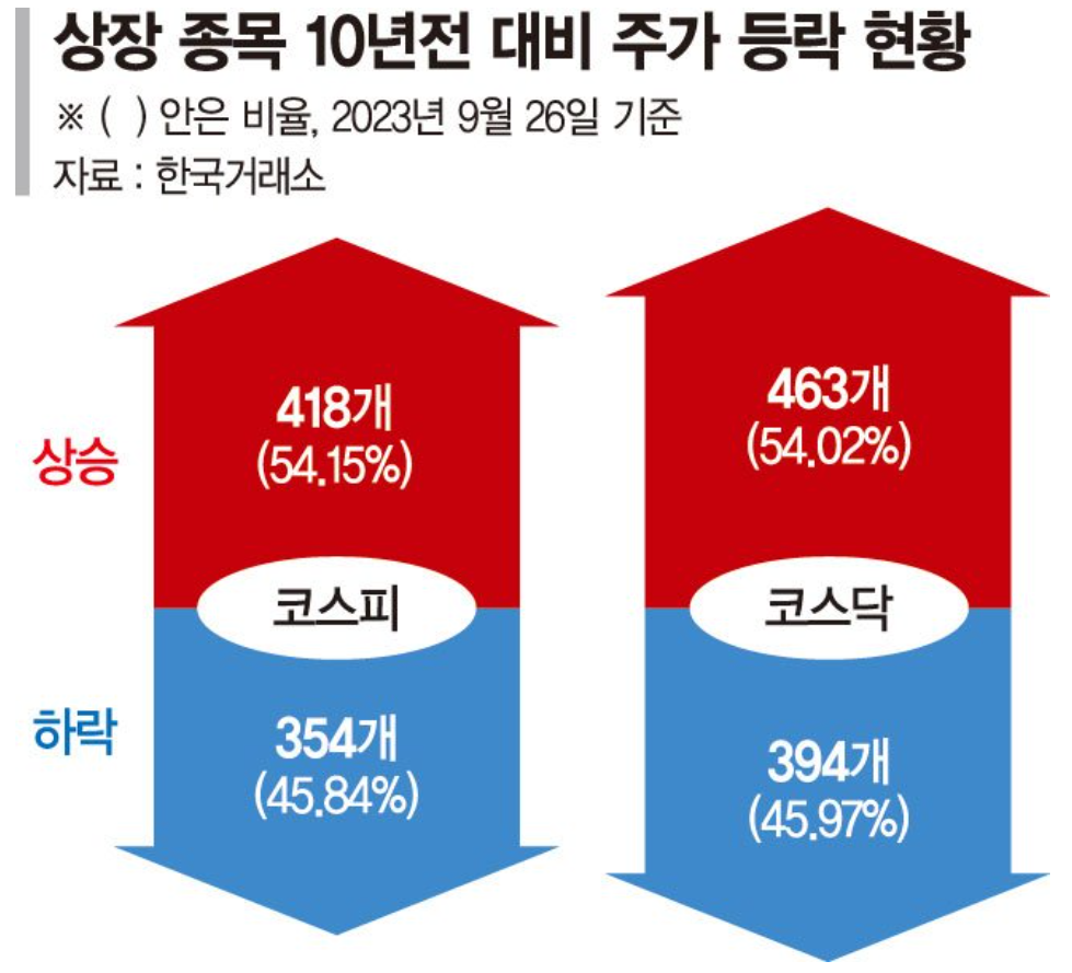 국내 유가증권시장(코스피)과 코스닥시장 상장사 10곳 중 4곳꼴로 10년 전보다 시가총액이 뒷걸음질친 것으로 나타났다고 합니다.. 상장폐지된 기업을 감안하면 10년 장투시 이익을 본 기업보다 손실을 본 기업이 더 많았습니다. '