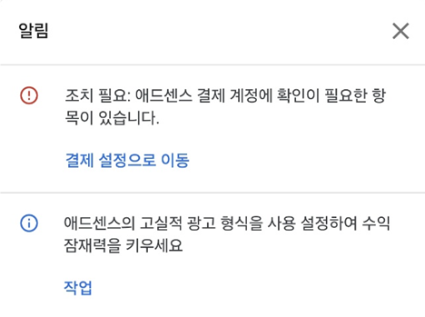 애드센스 결제 계정에 확인이 필요한 항목이 있습니다.